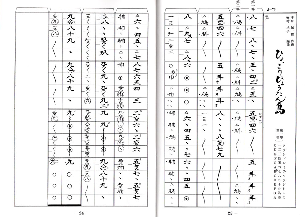 乃木調子は、平調子から四・九・六・斗を半音上げて作る明るい感じの音階です。